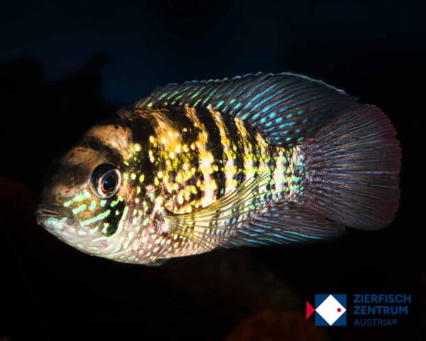 Nimmt kräftiges Frost- und Frischfutter (z. B. Garnelen, Muschel-/Fischstücke, Würmer) sowie hochwertige Cichliden-Pellets. Mehrere kleinere Portionen sind bekömmlich; Futterfische sind nicht notwendig.