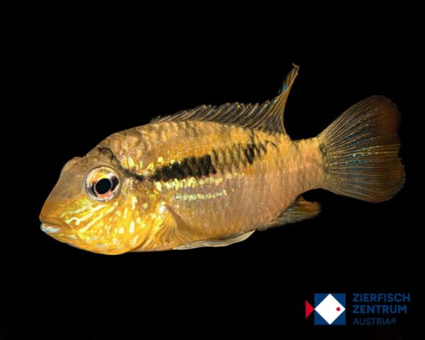 Eleganter Buntbarsch mit spannendem Brutverhalten (larvophiler Maulbrüter). In ruhigen, gut strukturierten Becken mit Sandboden kommt der Gebänderte Buntbarsch farblich und verhaltensmäßig besonders schön zur Geltung.