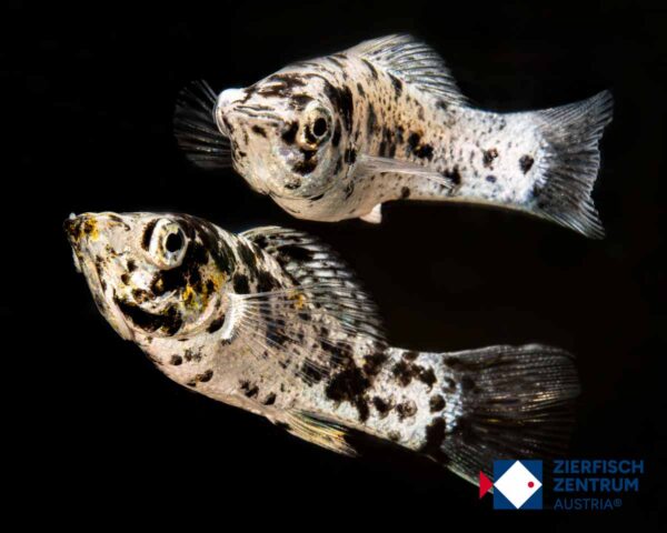 Gefleckte Zuchtform des kurzflossigen Mollys (Poecilia sphenops) aus Mittelamerika. In der Natur besiedelt die Stammart vegetationsreiche Flachwasserzonen von Kanälen, Lagunen und langsam fließenden Bächen; sie bevorzugt hartes, alkalisches Wasser und toleriert auch leicht brackiges Wasser. Die Dalmatiner-Zeichnung (weiß/silbrig + schwarze Flecken) wurde aquaristisch herausgezüchtet.